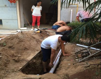 時(shí)間已近十二點(diǎn),維修人員顧不上吃飯休息,歷時(shí)一個(gè)多小時(shí)開挖地面一米左右,查找出了問(wèn)題管網(wǎng),該段管網(wǎng)發(fā)生斷裂,必須斷水進(jìn)行更換維修。為了盡快完成維修,不影響業(yè)主正常生活,維修人員頂著烈日,在又小又臟又悶熱的地洞里進(jìn)行搶修,最終在下午五點(diǎn)順利完成了維修工作,恢復(fù)了正常用水。